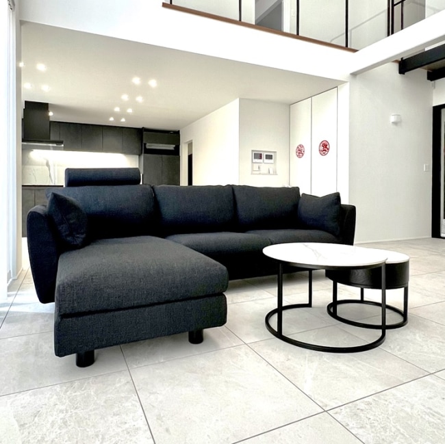 白色の床と黒色のソファの対比が素晴らしく