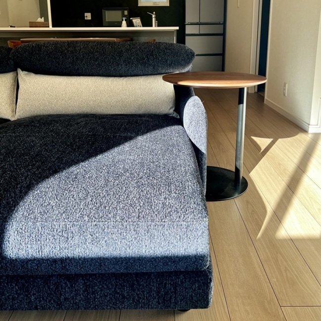 ソファ横でも、前でも使え、座った人の真横に天板を配置することが出来る