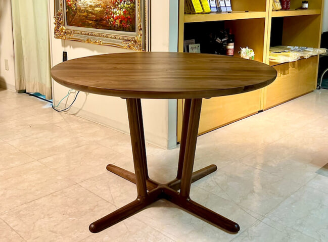 お客様オーダー分のウォールナットの丸テーブルを検品中にちょっとご紹介