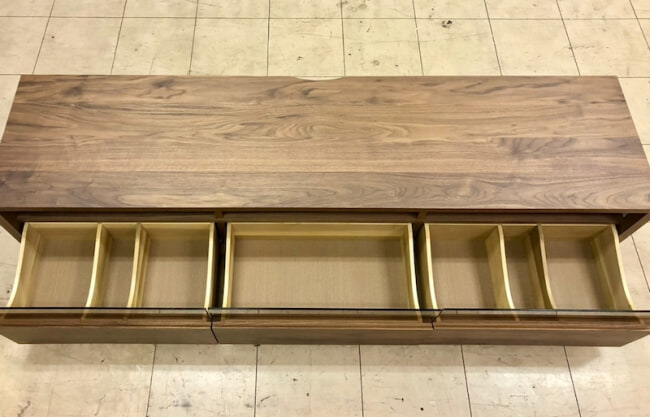 引き出しの前板と天板がウォールナット材無垢材でつくられています。